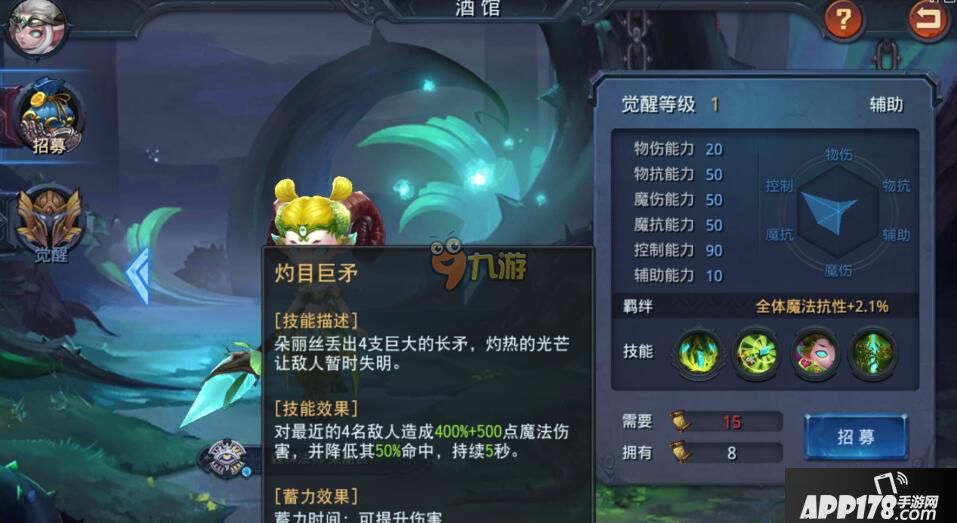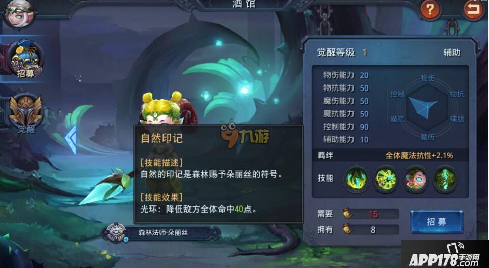 自然印记:自然的印记是森林赐予朵丽丝的符号。 光环:降低敌方全体命中40点。