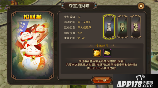 魔灵幻想夺宝招财猫活动简介:金币不够花?怎么能够放过那些招财猫,打一打就会掉落金币金条,行走伊甸城自带土豪光环!招财猫活动分为普通、噩梦、炼狱三种难度,玩家可以根据自己的实力选择对应的难度进行挑战,当然难度越高获得的奖励也越丰厚!当玩家角色与上阵宠物全部阵亡时,本次挑战即告结束。