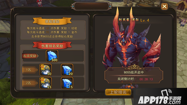 魔灵幻想世界BOSS活动简介:吐火者法尔也经不住勇士们的轮番轰炸,败下阵来。参与活动经验金币拿不停,还可以获得黄金史莱姆碎片和钻石。每次战斗造成45点伤害可以获得1经验,每次战斗造成90点伤害可以获得1金币,上榜还会获得排行奖励。最后一击的勇士,更可以获得500钻石的赏金啊!