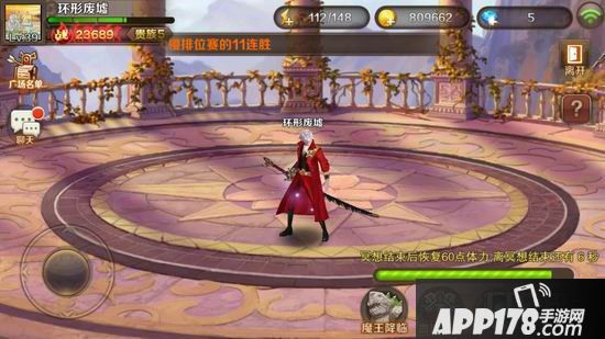 当各位玩家进入在勇士广场之后,大家可以在左上方可以看到广场中所有的人员名单,我们还可以左右移动观察下这个玩法,在右下角哟一个冥想功能,缺少体力的玩家可以利用这个功能获得60点的体力哦,冥想的时间不长,大概一分钟左右,但是每天只有一次机会。