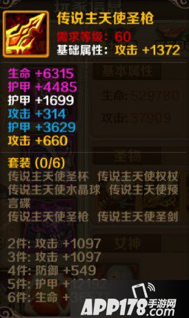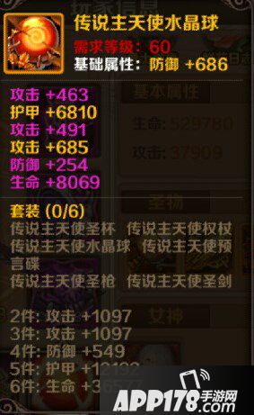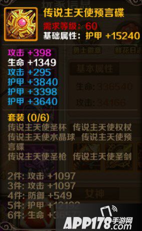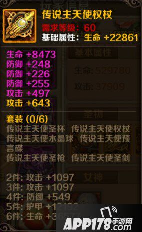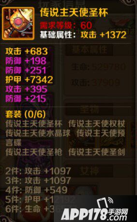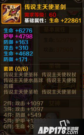 图中可以看出,当玩家们集齐6件传说主天使圣物后除圣物的基础属性和洗炼属性外额外会增加2194攻击、549防御、12192护甲和36577的生命。作为游戏中60级的最强圣物,传说主天神绝对值得玩家们入手,