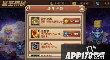 点击开始战斗会弹出战斗准备的框框。与卡牌游戏战前配置阵容不同,在这里玩家可以通过消耗金币或者钻石来获得BUFF增益状态,并且在挑战全过程中都持续生效。用钻石可获得指定的多个BUFF,用金币可随机获得一种BUFF。同时多个BUFF都可在战斗中生效。