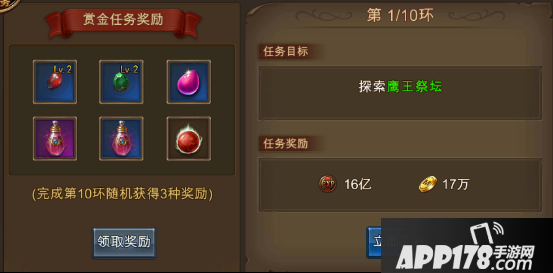 3.完成单个赏金任务会奖励大量经验和金币,金币奖励是所有活动中最优厚的。完成满10环后会从2级毁灭石、2级生命翡翠、魔仆精华、经验药水和坐骑丹中随机获得3种奖励。