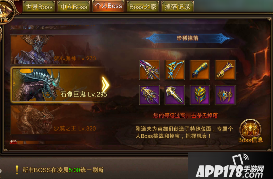 2.玩家只能挑战等级低于自身且差距不超过100级的个人boss,击杀BOSS后,系统会在每天凌晨5点刷新所有BOSS供玩家次日再次挑战。