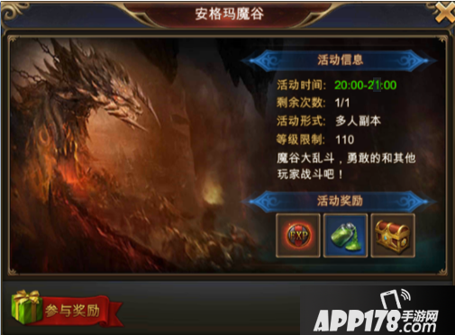 安格玛魔谷是一个大型多人集体活动,玩家110级后开启,可在每周一、三、五的晚上八点后参加,活动持续1小时。完成活动后会收获大量的神兵精华(可用来升级神兵,神兵是什么(°Д°),可以耐心查看下神兵的相关攻略噢!)奖励哟!