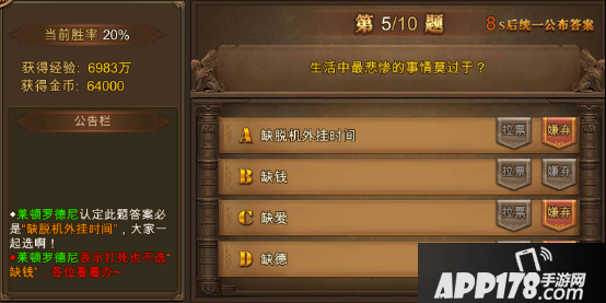 2.因为正确答案是由全区玩家选择最多的选项决定,所以号召大家认可你的答案就是制胜的关键,游戏里会有拉票和嫌弃选项,玩家可以通过选择拉票来号召其他人选自己的答案,所有的拉票和嫌弃操作都会在公告栏显示