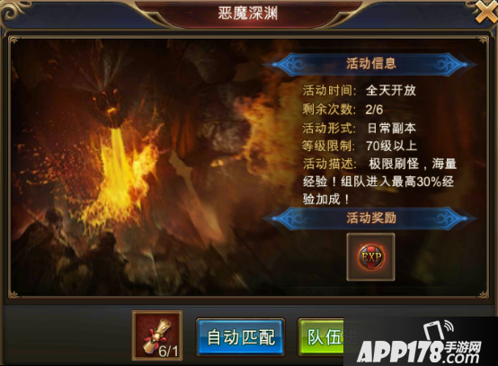 1.每天玩家共有3次进入恶魔深渊的机会,可单人进入也可组队进入,组队进入会有30%经验加成效果,若当前没有组好队,可以点击自动匹配快速组队进入副本。