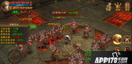 3.恶魔深渊每次进入只开放6分钟,每两分钟刷新出一大波新类型的怪物,玩家点击开启挂机即可在恶魔深渊中央开始高效的打怪升级了。