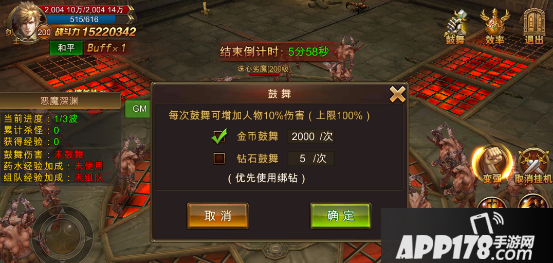 2.进入恶魔深渊后,可以进行鼓舞和效率提升,鼓舞分为金币鼓舞和钻石鼓舞,总共可以提升100%的伤害,让你在恶魔深渊里拥有整整两倍的刷怪能力!效率提升则是通过经验药水来提高练级效率,分别有1.5倍和2倍经验药水可以选择。
