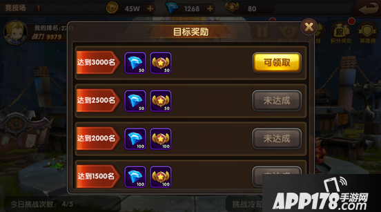 4.竞技场。竞技场目标奖励也有大量钻石,前期竞技场都是机器人,越早挑战,越容易提升排名,拿到目标奖励。