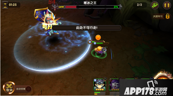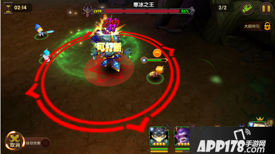 1、下图是寒冰之王的战斗场面,寒冰之王是魔法型boss的代表人物,释放技能为定点的面攻击,大家需要双击移动到指定位置躲避开对方的技能,或者使用坦克角色的控制技能打断他。
