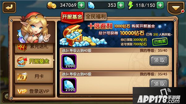 既然充值不多,就一定要把钻石更合理的利用。游戏内充值30元既可以到达VIP2级,成功到达这个等级后应第一时间购买“成长基金”,不要因为初期就要花掉1000钻石而感到心疼,“成长基金”的后期高达10倍返利绝对可以让你爽到飞起。