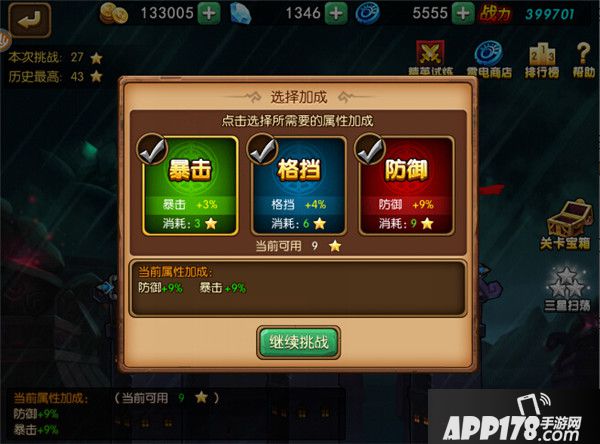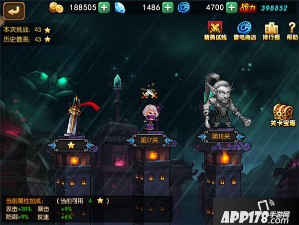 当玩家达到18级时,我们就可以跟随游戏的指引来到雷电王座当中了。在这个模式中,各个BOSS的三个难度选项也对应着三个不同的奖励——1、2、3个星星。消灭三个BOSS之后,我们可以通过获得到的星星升级团队的生命、暴击、攻击、血量等等不同属性。当然消耗星星越多的属性往往就是最优秀的那一个啦。