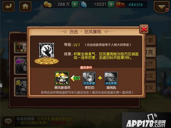 与此前的无合体技英雄不同,泰奶奶这次虽然没有自身合击技,但游戏中最强坦克暴风酿酒师却可以因为她的存在而激活最新合击技——狂风骤雨。要知道,这个技能的效果与此前一样,可以击退前方扇形区域的敌人,而合体技则可以追加眩晕2秒的效果。追求最强阵容的玩家们,我们可一定不要忽略了这个效果的作用。