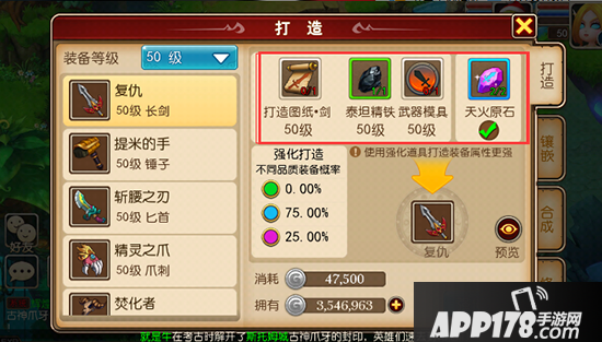 所以去打造吧!!!打造装备可是获得高品质装备的重要途径。在游戏的右下角,点击强化按钮,你就会进入打造这个界面。
