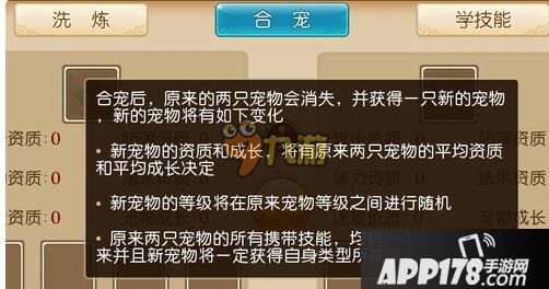 宠物宝宝合成之后,原来的两只宠物会消失,并且获得一只新的宠物,新宠物的资质和成长由原来的宝宝平均资质和平均成长决定。