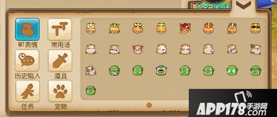 表情分为:MT表情、常用语、历史输入、道具、任务、宠物