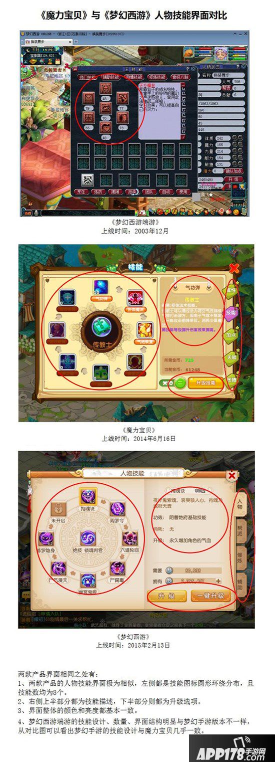 第一组是我们找到的游戏技能升级的截图,一共三张,第一张是网易有10年历史的《梦幻西游》端游界面;第二张是网易在2015年2月推出的《梦幻西游》手游界面;第三张是完美在2014年6月推出的《魔力宝贝》手游截图。