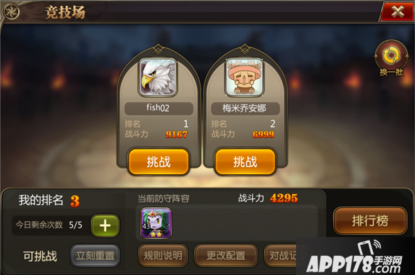 每天会有5次的免费挑战机会,挑战次数会根据VIP等级不同增加上限。每天21:00根据竞技场排名可以获得大量的钻石、金币以及荣誉值。