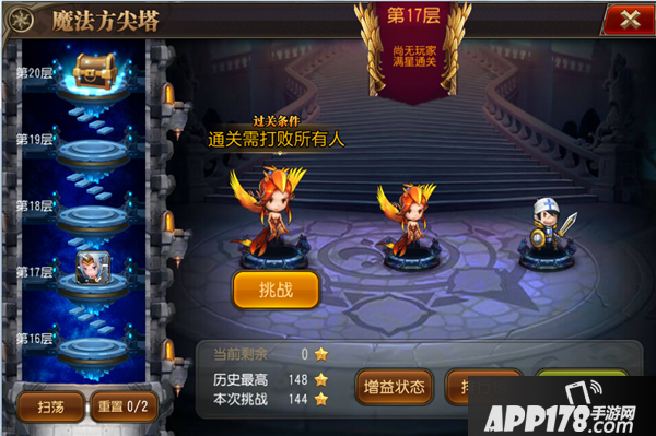 通过主界面进入系统界面,玩家点击挑战后将会进入战斗界面,每层设置有3个敌人,并且可以选择挑战难度,分别为,简单、普通、困难。挑战胜利后可以获得对应的星数,星数可以用选择不同BUFF来加强自己的战斗力。每5层为BOSS关卡,BOSS关卡会设置不同的通关条件。首次通关后可以活动强力装备。每次击败敌人可以活动相应的“熔炼值”,玩家可以使用熔炼值来获取强力的橙色装备哟。准备好最强的战力迎战吧。