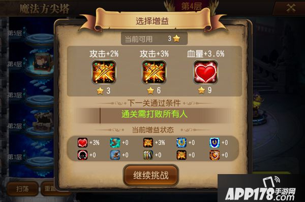 方尖塔的前10层,我们都要选择3星过关,因为前期能够最快的去换到蓝装,蓝装在竞技场中将提供非常大的优势。在BUFF选择方面需要根据自己队伍的属性来进行选择。