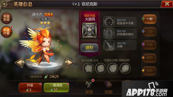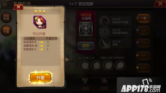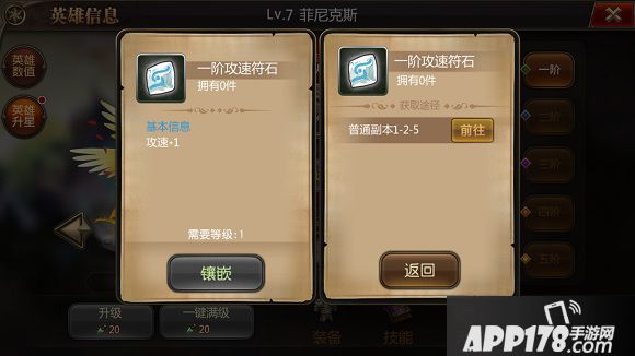英雄天生带有天赋,天赋共分为5阶,一阶的天赋需要附上4个符石后才能进阶开启,二阶、三阶对符石的需求会进行递增。符石的获得途径为副本,集市等。同时若需要对于某个符石的产出,直接点击对应符石位置,即会有相应提示,同时可以点击前往副本获得符石。