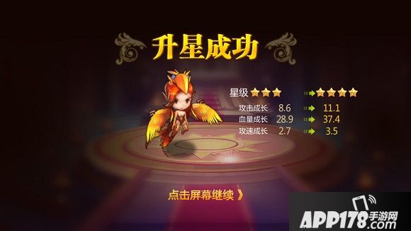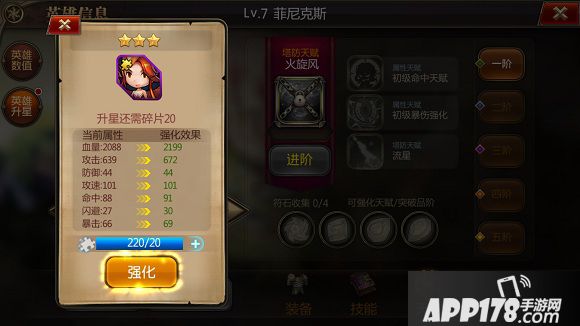 出现星级为3星,升到4星需要100片碎片,没点击强化一次,消耗20片碎片。同时属性提升至强化效果。没消耗一次,提升到4星的碎片所需显示将会减少。升星时,属性将再次提升至升星效果。