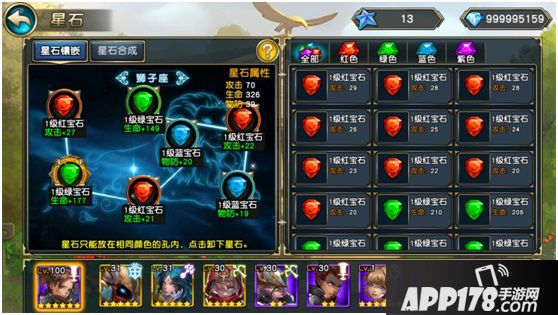 星石总共分为4个颜色(红、绿、蓝、紫),也分别增加不同的属性,根据每个英雄独特的守护星座,可以镶嵌的宝石也都不同,其中金色的插槽,可以放置任意颜色的星石,所以也会造就每个英雄独特的特色。