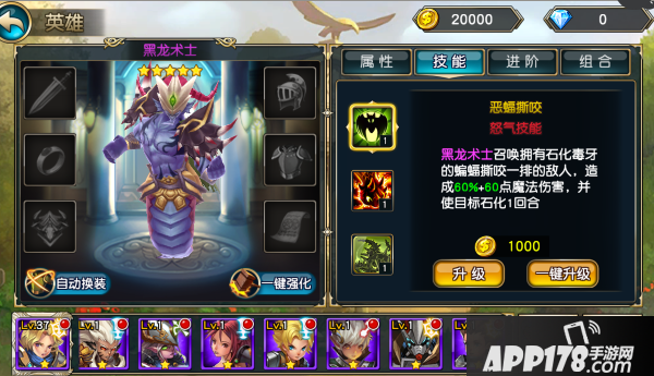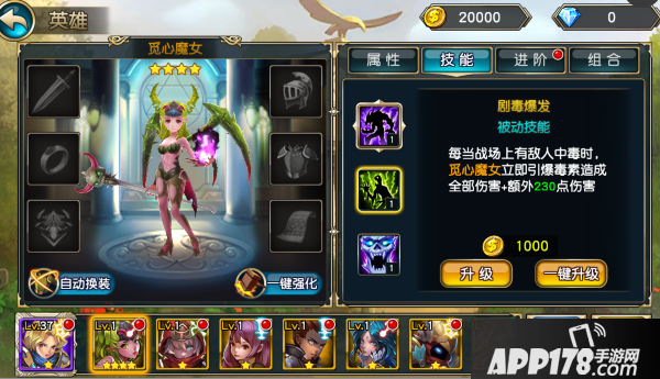 阵容特点:以丨觅心魔女丨2技能为核心搭配丨暗影刺客丨+丨黑龙术士丨,每次让对面中毒时候100%追加伤害。这个阵容适合有比较强力肉盾前提下,比如圣骑主角和守护天使(其中之一即可)