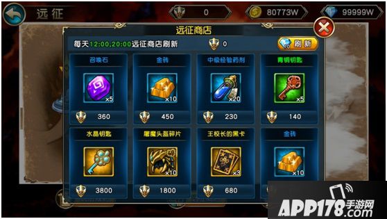 冒险副本中,另一个特色的玩法,就是远征了,这个是考验您英雄团队耐力的时候了。总共12个关卡,途中英雄的生命损失与死亡是不会恢复的,每通过一个关卡都可以开启一个宝箱,通过最后一关,更有黄金宝箱等着大家。可以获得包括英雄碎片等各种奖励,还可获得远征点数,可在远征商店兑换稀有装备与各种道具。