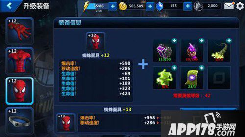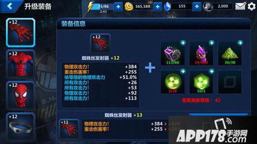 点击屏幕左侧【装备】,可以看到每个英雄有四个装备,这是本游戏的一个特色,蜘蛛侠的是喷蛛丝装置、经典服装、头套和腰带,每个装备都有独特的属性加成,在升级时加成都会有提升(难不成还削弱?)