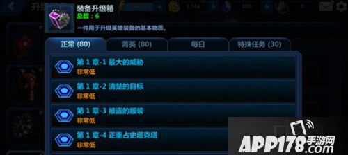装备升级需要指定的道具,如果想要装备的等级快速提升,就要多多收集装备升级箱。升级到一定的等级之后,还需要额外的其他道具。装备升级箱基本所有的关卡都有掉落,其他道具有特定的关卡,需要玩家根据不同的英雄去刷!