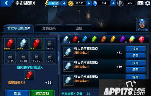 在英雄界面选择装备宇宙能源X即可进入装备界面,玩家可以查看自己当前所有的宇宙能源X,并且对宇宙能源进行管理。目前一共有9种的宇宙能源X,每一种都可以增加不同的属性。