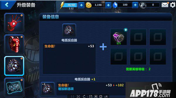 电弧反应堆,钢铁侠战斗的能量来源,在托尼心脏的位置。电弧反应堆是钢铁侠当初制造的方舟反应炉,如果没有它装甲不可能这么轻便,也不可能持续战斗几天几夜。它是能量的来源,可以提供战斗的一切能量,包括飞行、发射武器等所有需要的能量。在游戏里它是钢铁侠的生命值,升级可以增加生命值。
