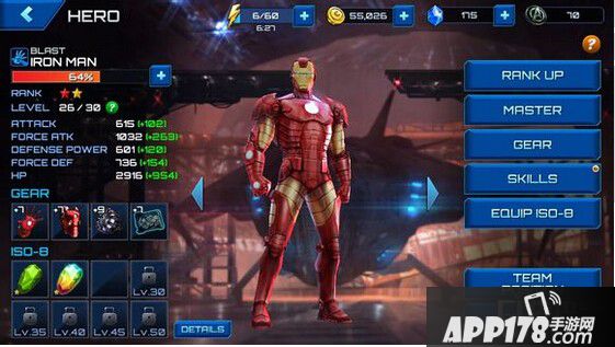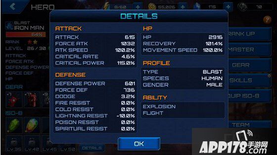 首先,关于Rank Up 升阶,即为升星。升阶所需要的材料为英雄碎片和金币,每次升阶都可以提高英雄等级上限和属性,同时从三星开始解锁技能。第二个 Master 精英。这里所需要的材料为Source Of Mystery,精英等级的表示就是星星变为红色,上限由总星数决定。在下面Gear 装置 ,也就是俗称的装备之中,点入可将装备升级,所需材料不定。Skills 提升技能等级,消耗金钱。最后Equip ISO8,就是带装备,各种颜色及各种属性的加成,但需要注意的是这个装上之后将无法拆解。