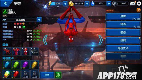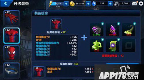 点击屏幕左侧【装备】,可以看到每个英雄有四个装备,这是本游戏的一个特色,蜘蛛侠的是喷蛛丝装置、经典服装、头套和腰带,每个装备都有独特的属性加成,在升级时加成都会有提升(难不成还削弱?)