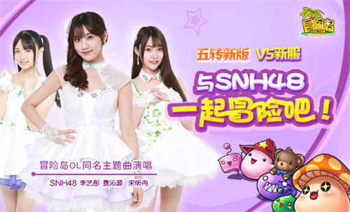 此次《冒险岛》的同名主题曲,也是由素有“国民美少女天团”之称的SNH48李艺彤、费沁源和宋昕冉演唱。双方的合作,可谓国民级的相互碰撞。与传统偶像组合出道形式不同的SNH48,用专属剧院公演、握手会、年度总选举等方式,一举开创了国内女团“强粉丝经济“模式。除了在游戏V5新版本发布当天同步推出,《冒险岛》同名主题曲还会在SNH48日后的活动中被持续演绎。