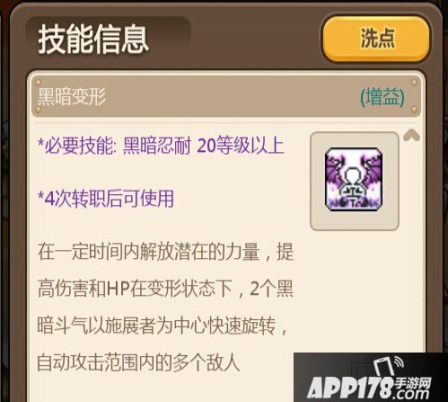 黑暗变型是恶魔的增益技能,是玩家在四转94级之后才能学习的。