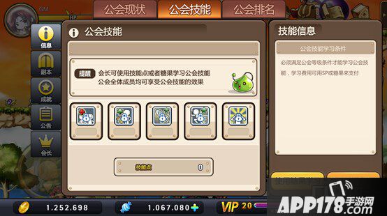 公会技能:公会达到一定等级,公会长可使用技能点或者糖果学习公会技能,公会全体成员均可享有公会技能增益效果