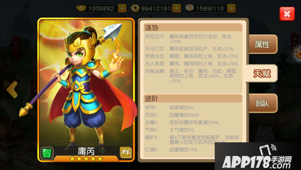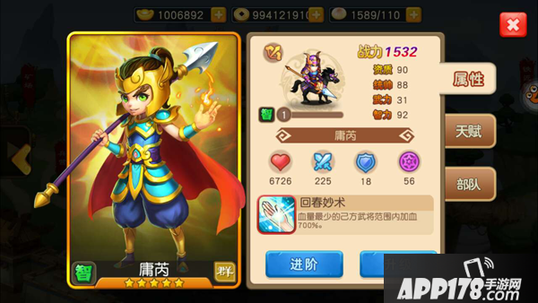 5星武将,资质为90,统帅88,武力31,智力92,初始战力为1532。