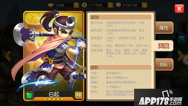 白起的连协分为生命与攻击加成,与不同武将同时上阵加成属性也不同,特别是合纵连横5位武将同时上阵后增加生命与攻击双属性加成。