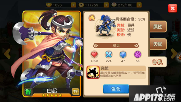 白起配备为骑兵,克制敌方弓兵为主,移动速度慢,随着强化等级越高对敌方弓兵造成越高的伤害。