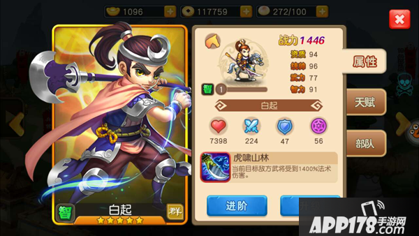 游戏中白起资质为94,统帅96,武力77,智力91,初始战力1446。