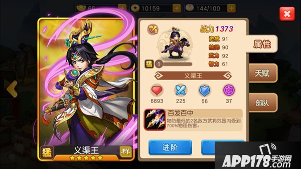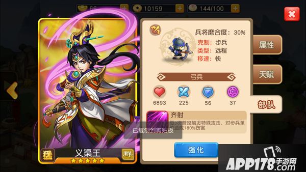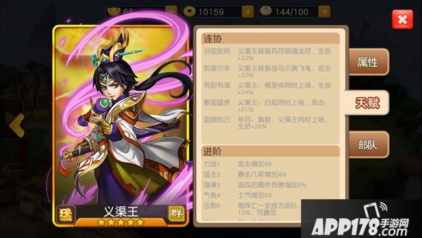作为义渠王,义渠王的连协技和进阶技能也相当实用,增加武将攻击力和生命值的光环技能极为出彩。加血加防的技能也很好的保证了义渠王能够在场上长时间存在。