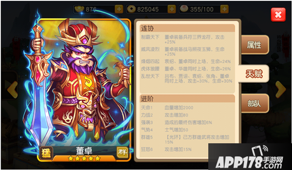 董卓,吕布,贾诩,袁绍,张角在本作中五人同时上阵时,可触发连协技——乱世天下,五人的攻击和生命均提高30%,自身的进阶技群雄,更是能提高群雄武将的15%攻击力,成为一位带兵猛将。