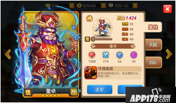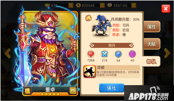 董卓带领的是克制弓兵的骑兵,配合其自身的技能、进阶技和连协,能巨量增加攻击,快速杀死敌方后排武将。