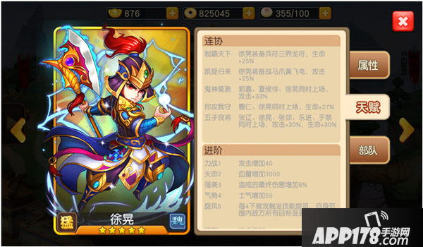 身为五子良将之一的徐晃,其连协技能和进阶技能非常的强悍,当五子良将同时上场时,更是有30%的攻击和生命加成,大量的增加攻击和伤害的技能使得他在对战时造成大量的伤害。高额的血量也让他起到了一个前排的作用。