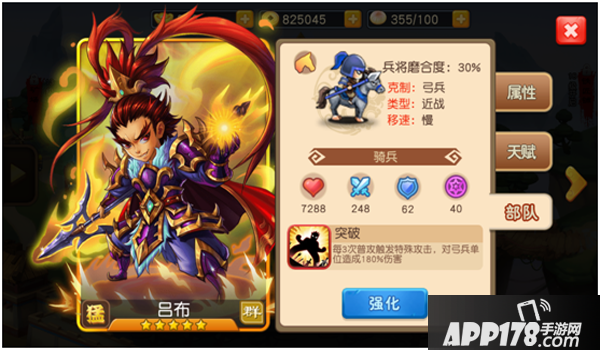 吕布带领的是克制弓兵的骑兵,由于吕布的初始武力值为满点,在配合其全屏伤害和压制进阶技,使其能在战斗中造成成吨的伤害,更是能秒掉敌方脆皮,从而获得怒气,快速释放技能,赢得比赛。