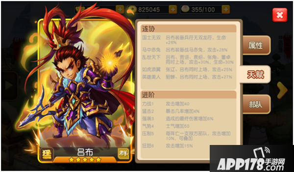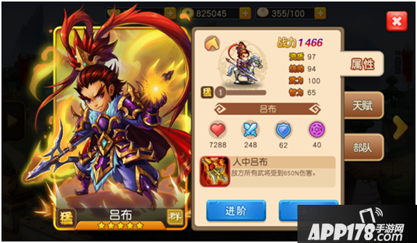 本作中,吕布是一位5星金色猛将,初始战斗力达到了1466点,资质也达到了97点,统帅达到了94点,武力更是达到了惊人的100点满点,成为本作中初始攻击最高的武将。