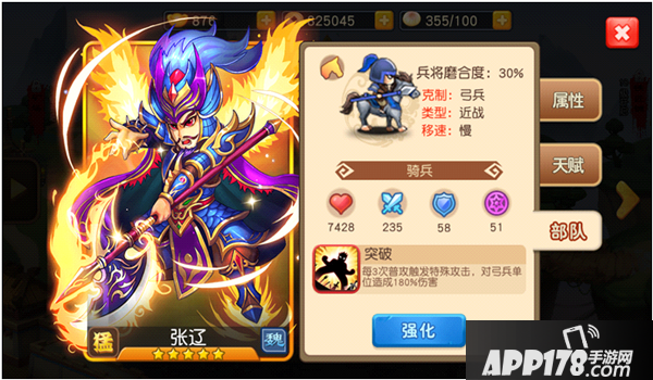 张辽所带领的兵种是克制弓兵的骑兵,配合着其强大的输出能力,切入敌方后排即可造成成吨的伤害。